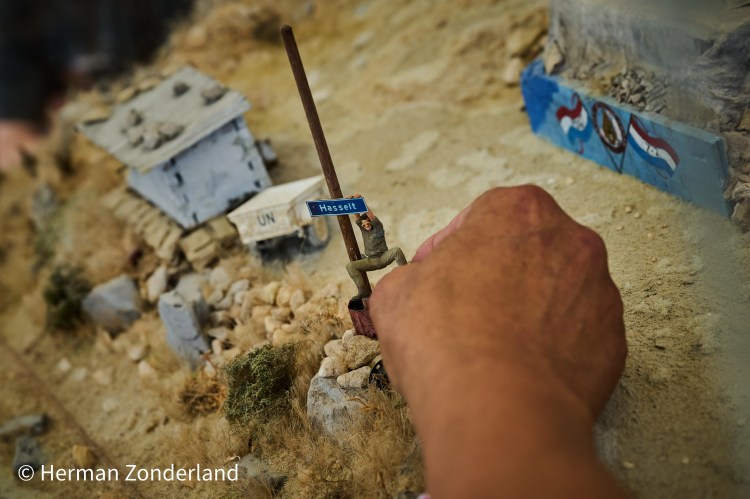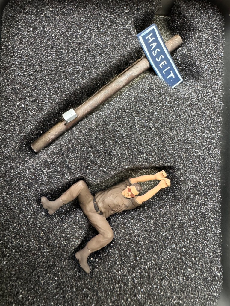 3). En dan is, als klap op de vuurpijl het figuurtje van Henk Haasjes door Schrumpfmich geleverd. Toch knap hoe zij van een oude en onduidelijke foto de positie en houding van een persoon kunnen namaken. Oke, er missen hier en daar van details aan het uniform maar ga er maar aanstaan. Kijk die handjes van mini Henk eens, ze zijn zo geconstrueerd dat hij zonder lijm aan het plaatsnamenbord kan hangen! De bijgeleverde paal met plaatsnaambord blijven wel in het doosje want die hadden wij reeds al jaren op z’n plek staan.
