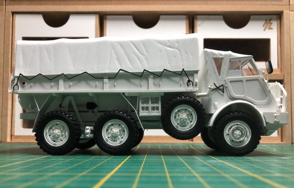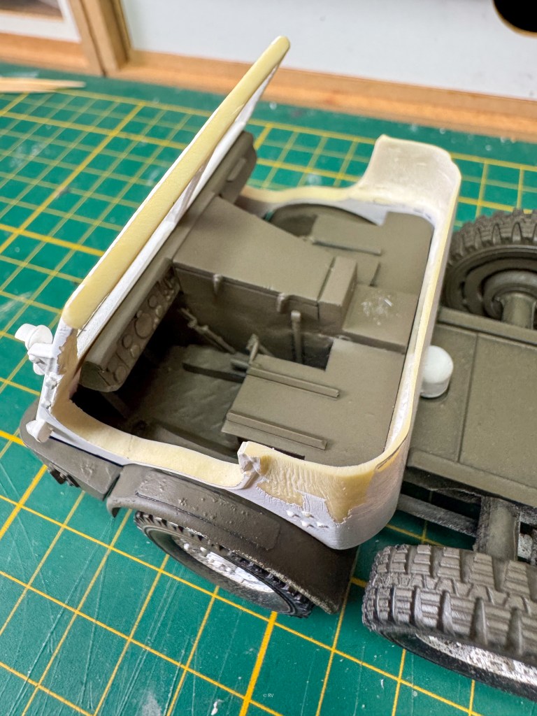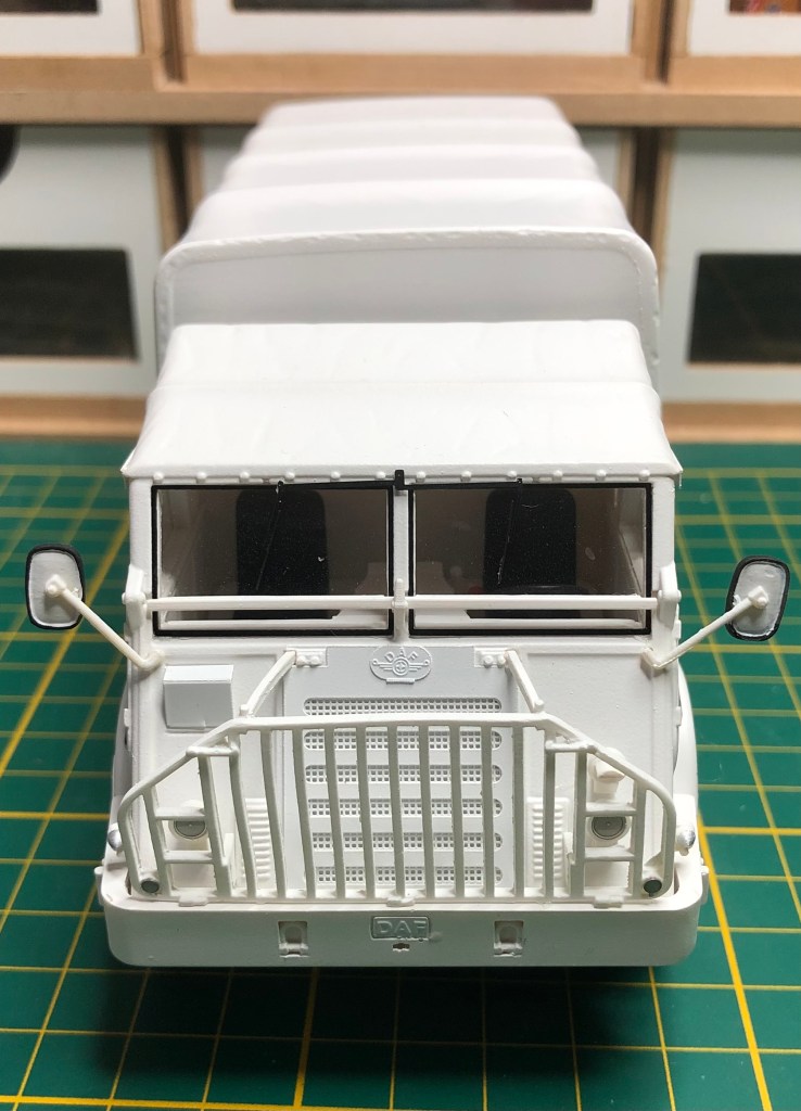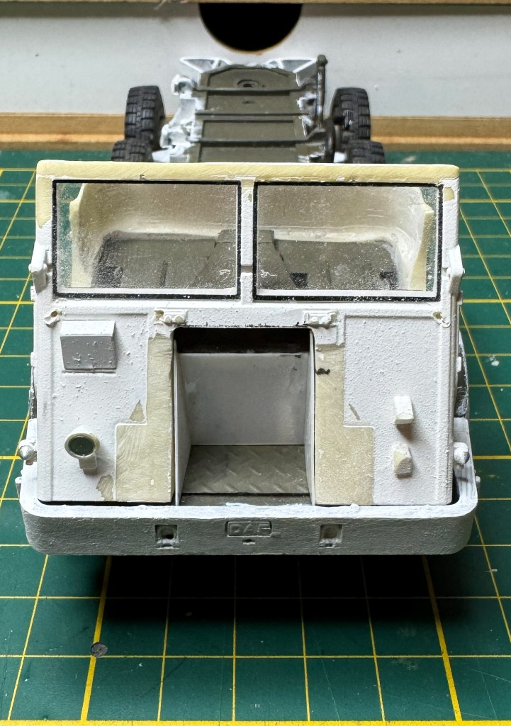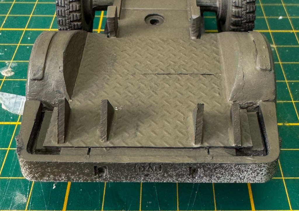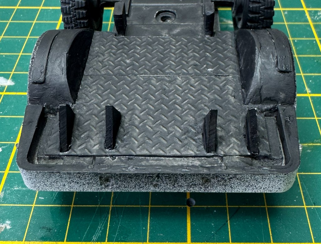 Helaas was er geen traanplaat in de exacte schaal te krijgen maar voor nu heb ik daar vrede mee. De (schuin aflopende) wielkasten waren een uitdaging en na een laagje verf moest er wéér geschuurd worden omdat er teveel lijm en putty resten zichtbaar waren.