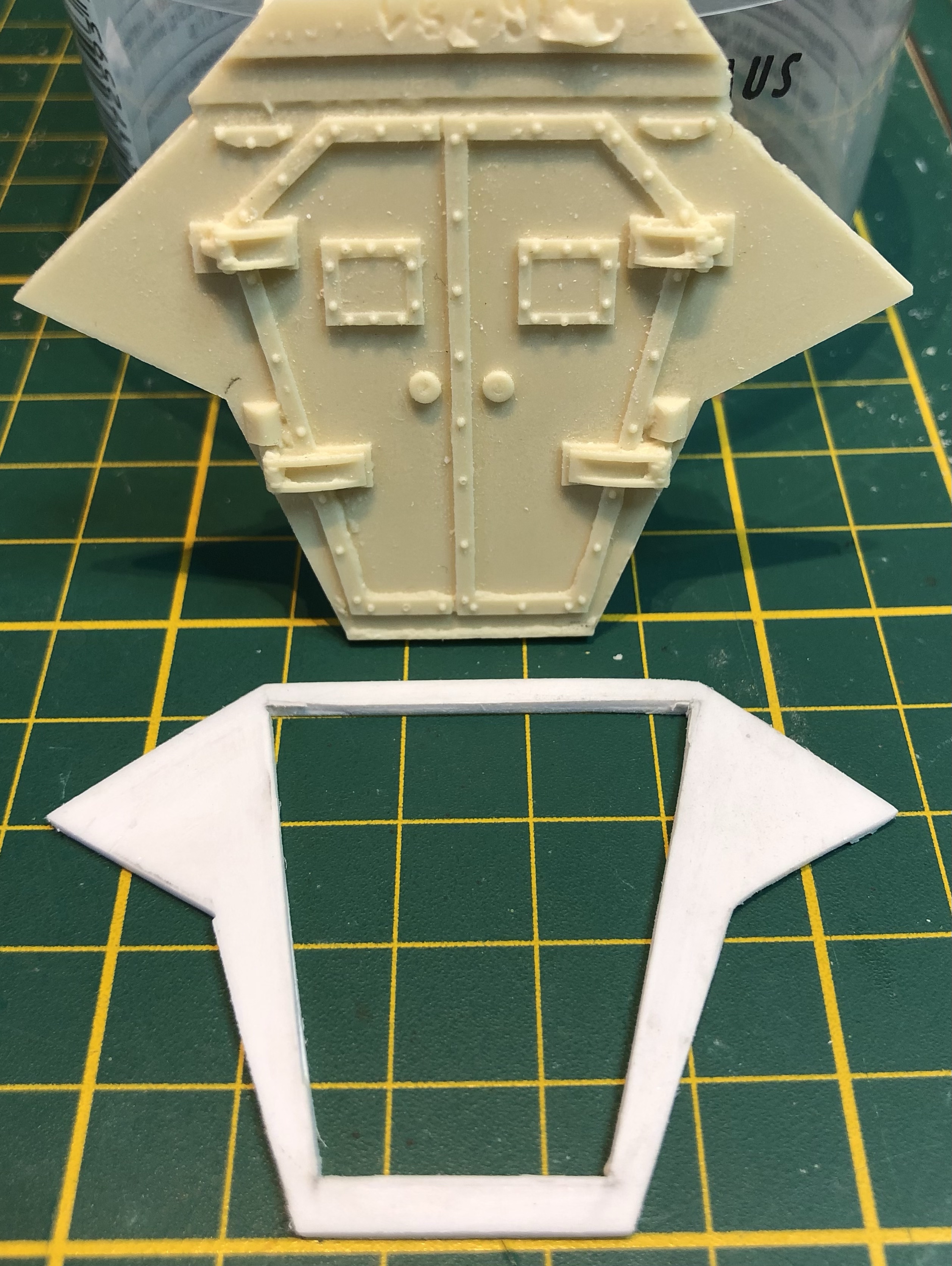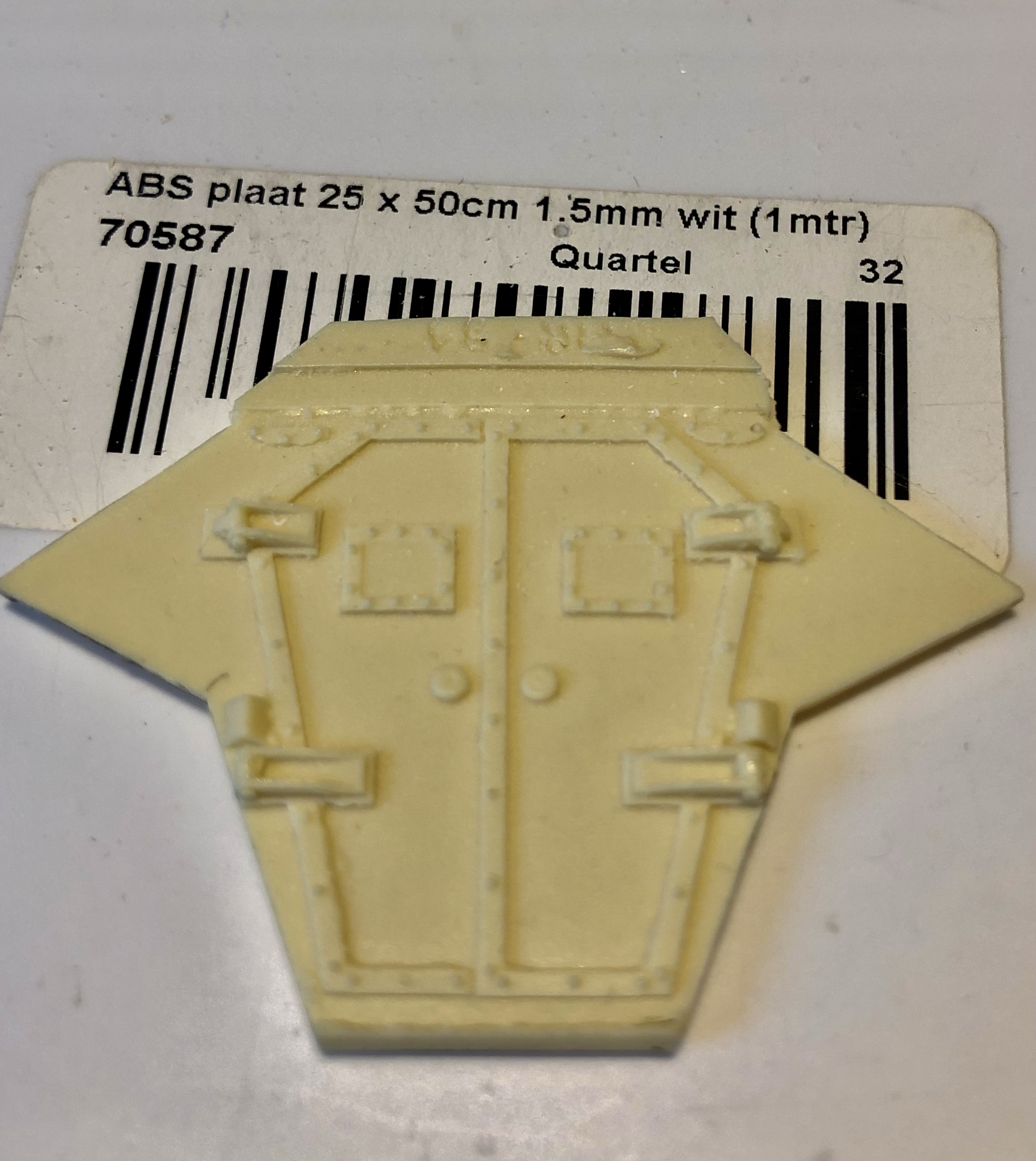 Na het resin deel grondig van alle neven stukjes te hebben ontdaan (m.u.v. het bovenste stukje) en de pasvorm te hebben gecontroleerd is dit deel zonder deuren uit een stuk ABS plaat gesneden. Hierna de deuren verder vrij gemaakt van de achterwand om de plaats van de scharnieren op het ABS af te tekenen, waarna ook de deuren van elkaar los te snijden. Dit lossnijden gedaan met een verhit breekmesje. Tja, ook ik maak soms foutjes 😀, dus de binnenhoekjes in het ABS plaatje er later in toegevoegd.