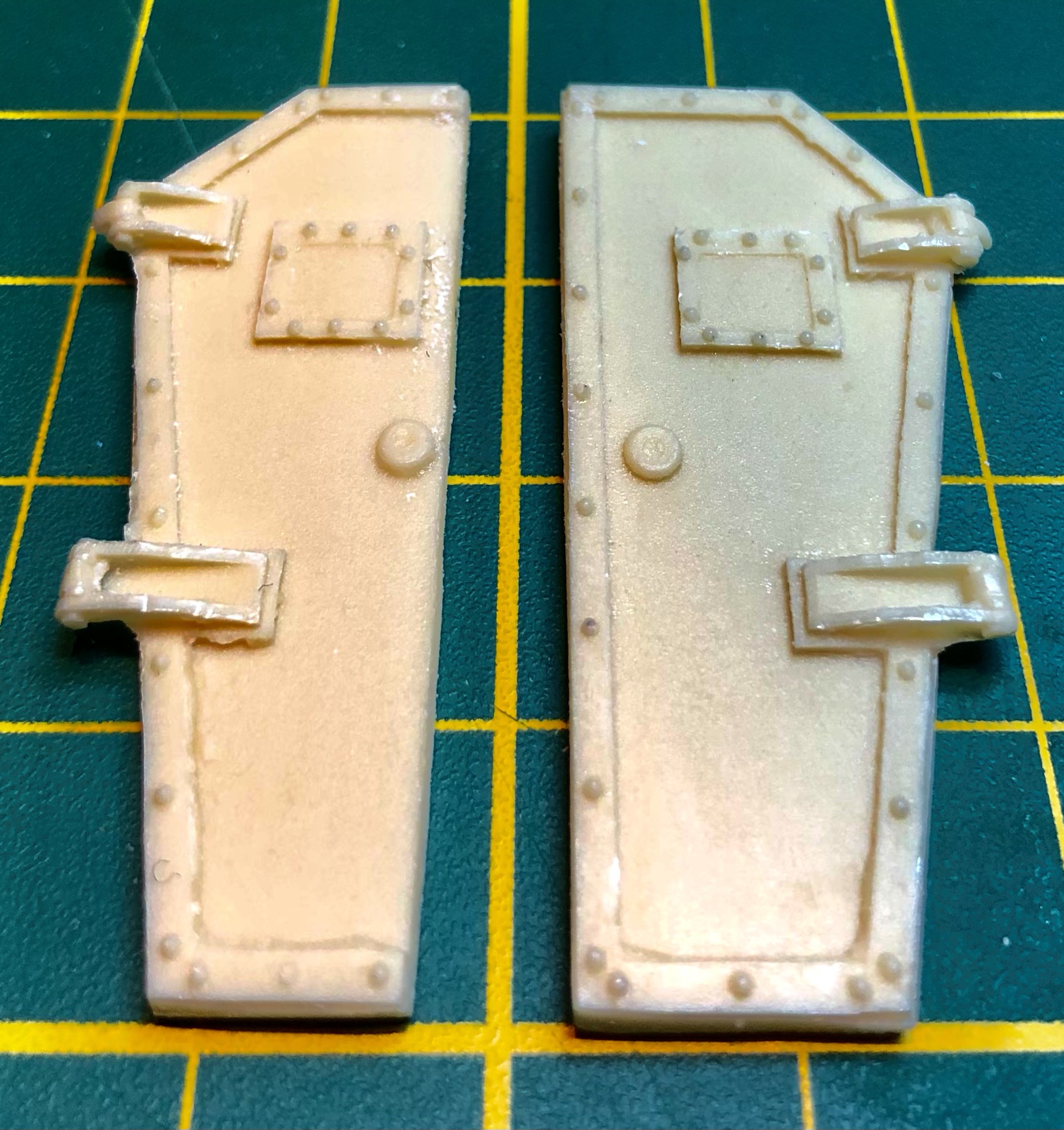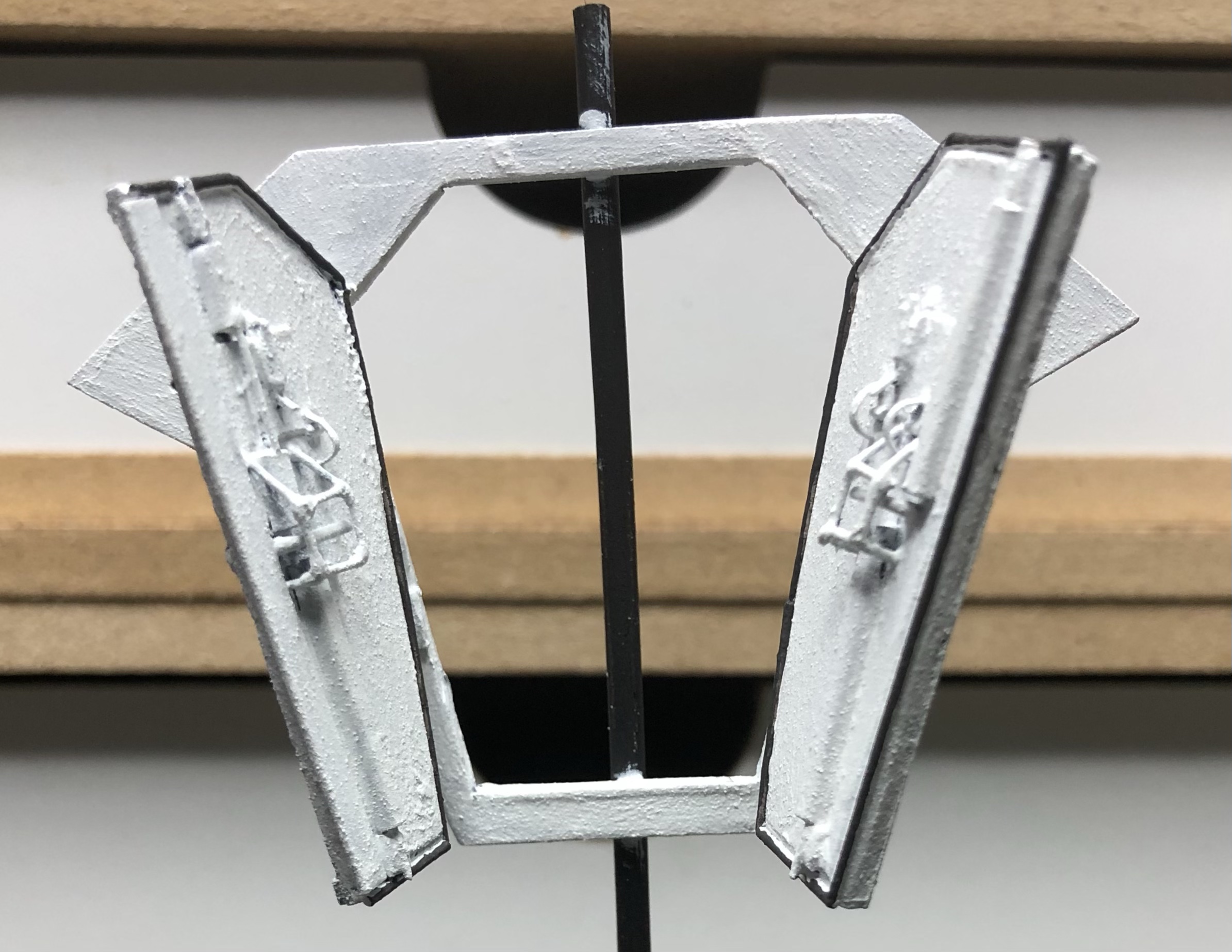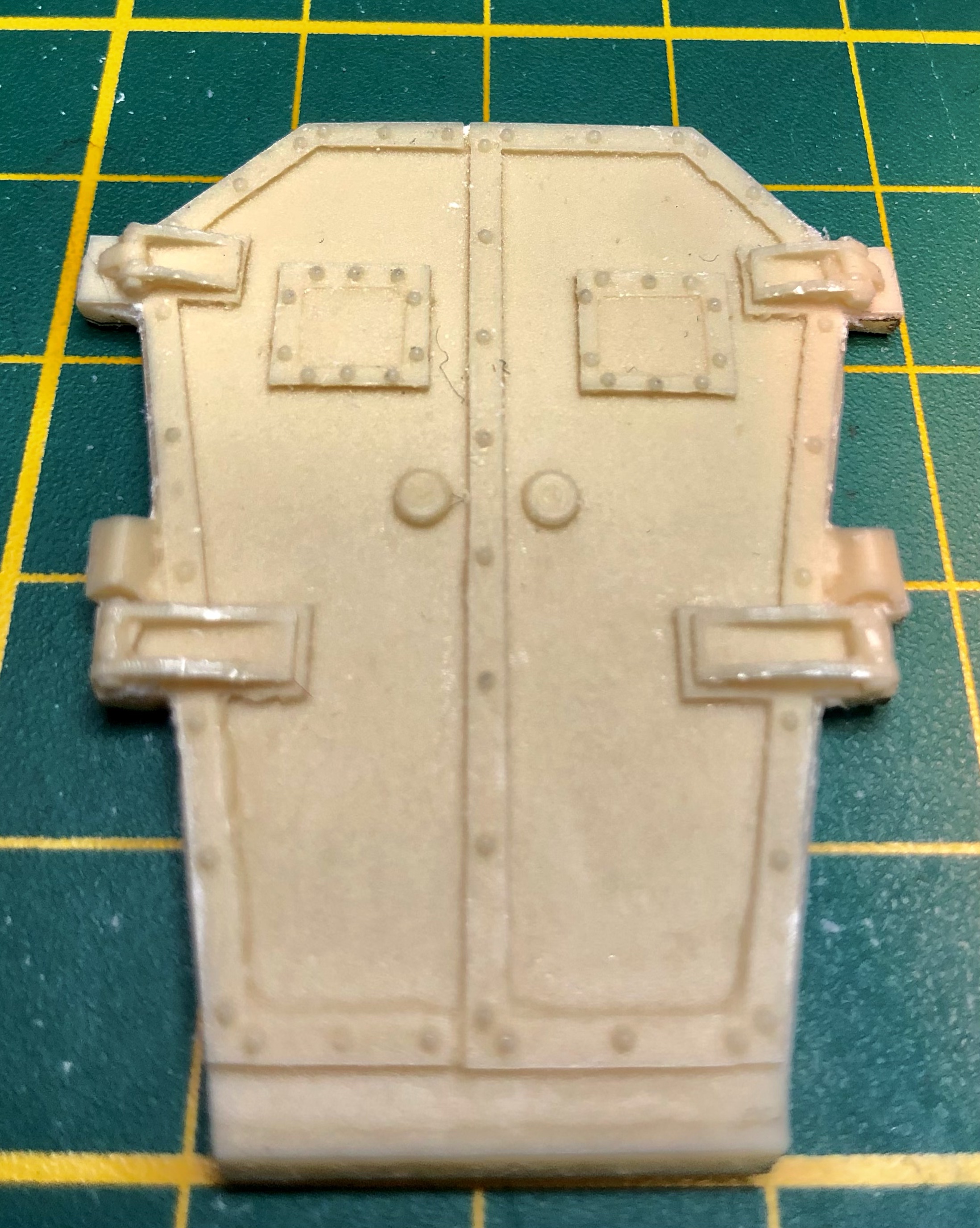 Toen de deurtjes op het frame waren geplaatst zijn deze verder aangekleed. Hiervoor gebruikte ik rest stukjes polystyreen, ijzerdraad en photo-ets. Om de deurrubbers na te bootsen werden stukjes uit een vulpotlood gebruikt, dit na eerst de scherpe kanten van de deurtjes te hebben weg gevijld.