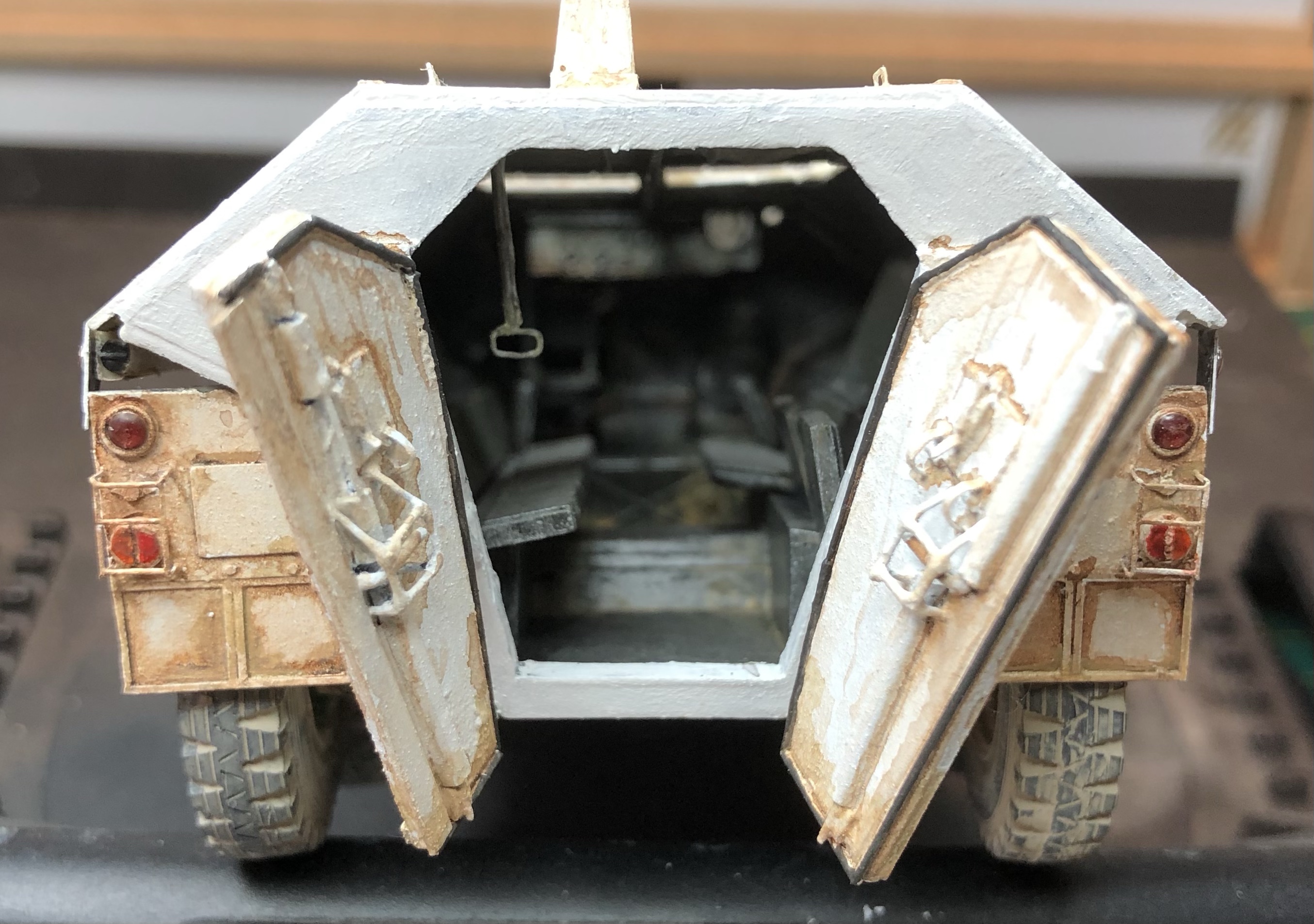 Ik ben er nog niet over uit hoe ik de achterkant ga afwerken. De deuren en het achterstuk bestaan uit één stuk giethars en omdat ik de deuren perse open wil hebben, moet er flink wat worden aangepast en zal er een deel verloren gaan. Maar wat er uiteindelijk uit gaat komen, hier alvast een kijkje naar binnen.