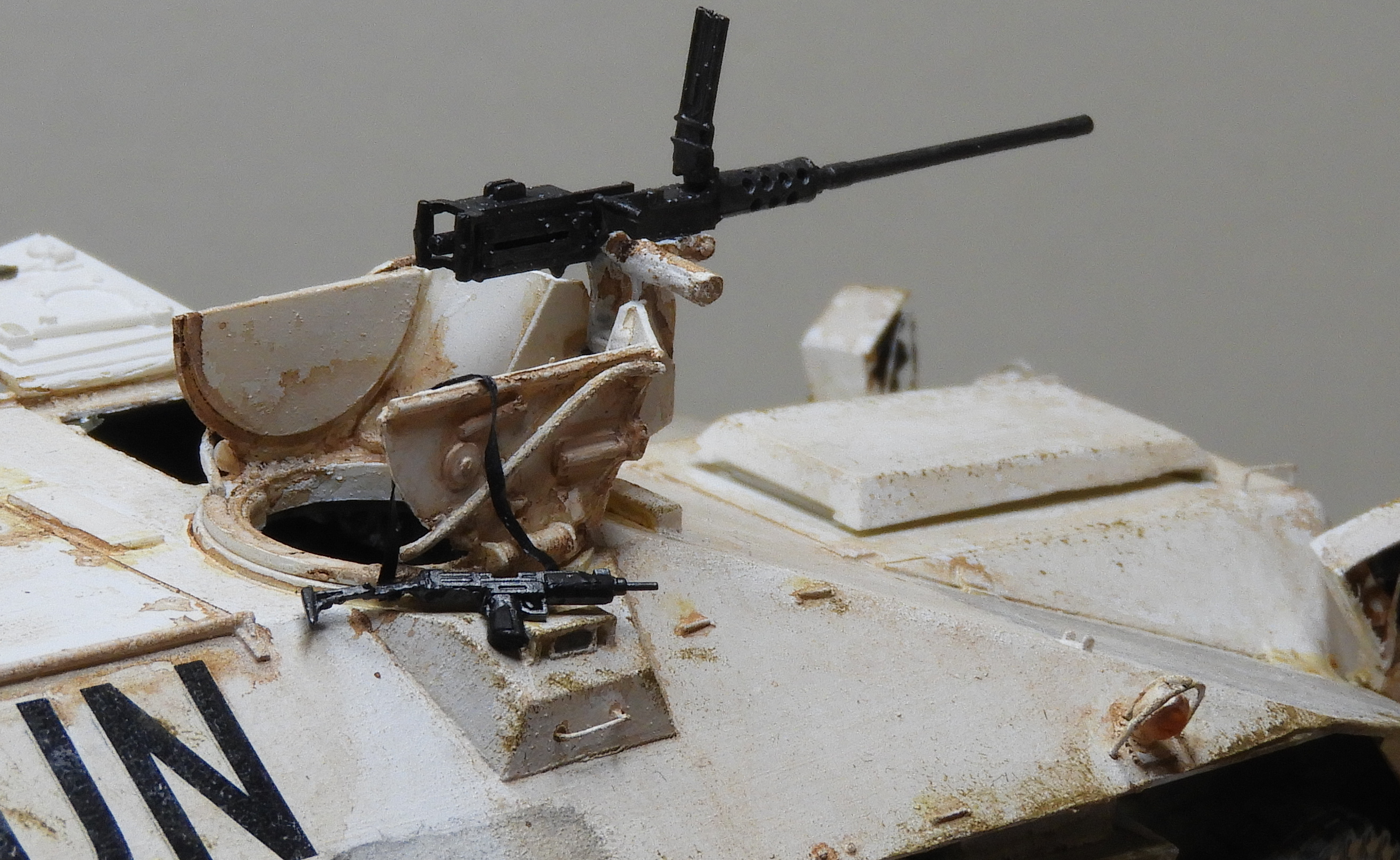 09-12-2019 |Eindelijk konden er wat leuke dingen aan de YP worden toegevoegd, namelijk wat persoonlijke uitrusting van de bemanning. De twee Uzi’s behoren toe aan de boordschutter en de chauffeur, die met regelmaat hun wapens op deze manier aan het voertuig lieten hangen. Waarom zou je ze ook meenemen als je een bemande bemenste post bezoekt. (Bemenst is trouwens een grapte op de politieke hype deze dagen. Ik ben het er volstrekt mee oneens trouwens).