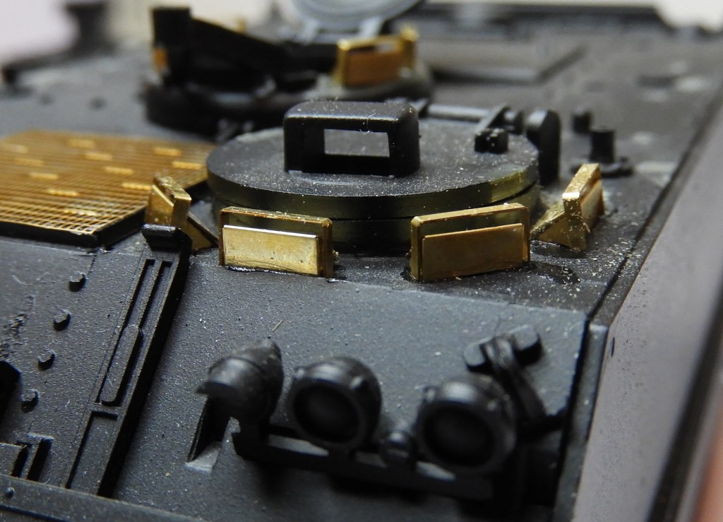 De afgelopen weken is veel tijd gestoken in het upgraden van de M113, het meeste met photo etch en enkele van resin. Er zit een groot verschil tussen het photo etch van ‘Verlinden’ en ‘Eduard’. Eduard is stukken makkelijker te verwerken en netter afgewerkt. (De Verlinden onderdelen hebben toch veel schade geleden door de tand des tijds). Al met al redelijk tevreden met hetgeen er tot nu toe uit mijn vingers is gekomen, maar kijk met grote vrezen op tegen de nog kleinere onderdelen. De grote antenne, die tussen de uitlaat en het rek moet komen, bewaar ik voor het allerlaatste. Die lange antenne is super fragiel en steekt overal bovenuit en dat wil je niet in de weg hebben zitten, dat gaat geheid fout.