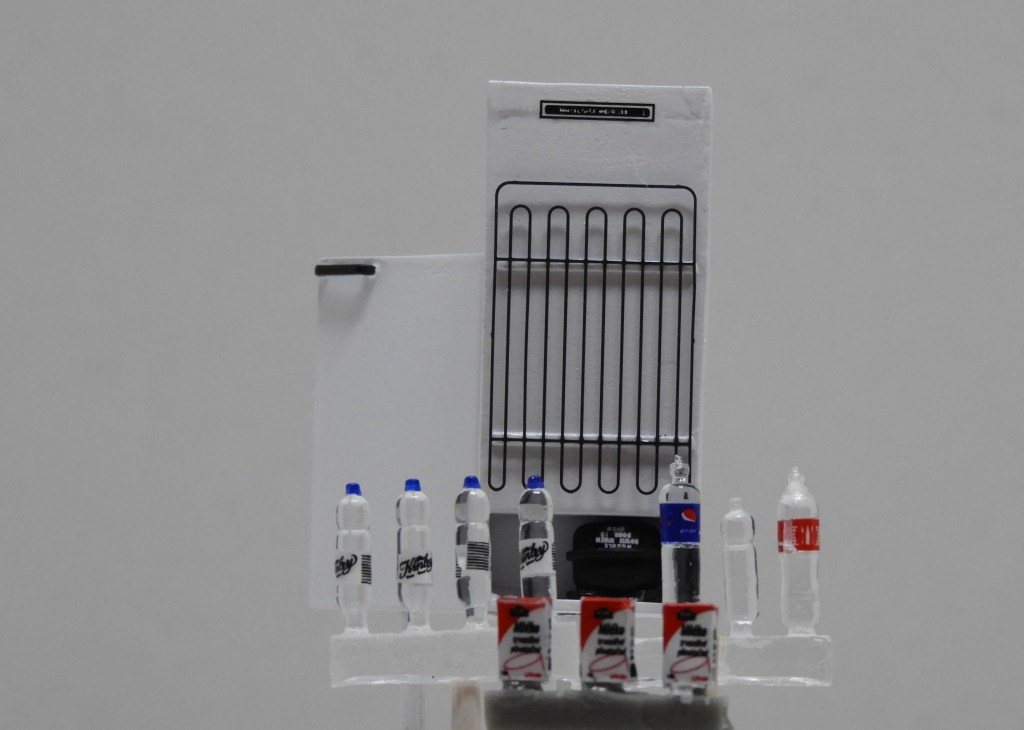 De laklaag van de koelkast is helaas gaan craqueleren. (Niet direct met het blote oog waarneembaar, maar wel op een uitvergrote foto). Na de eerste primerlaag met ‘One Shot van MIG’ nog geen problemen. Na gebruikt te hebben gemaakt van een witte, verdunde, AK verf ontstond dit probleem na aanbrengen van meerdere lagen. Helaas, het zij zo. Uit restanten decalsheets zijn wat kleine teksten gesneden om als extraatje aan te brengen. Rest nu nog een passend afsluitrubber te vinden, wat beschadigingen aanbrengen en het geheel te weatheren. Uiteraard zal de koelkast nog meer inhoud gaan krijgen.