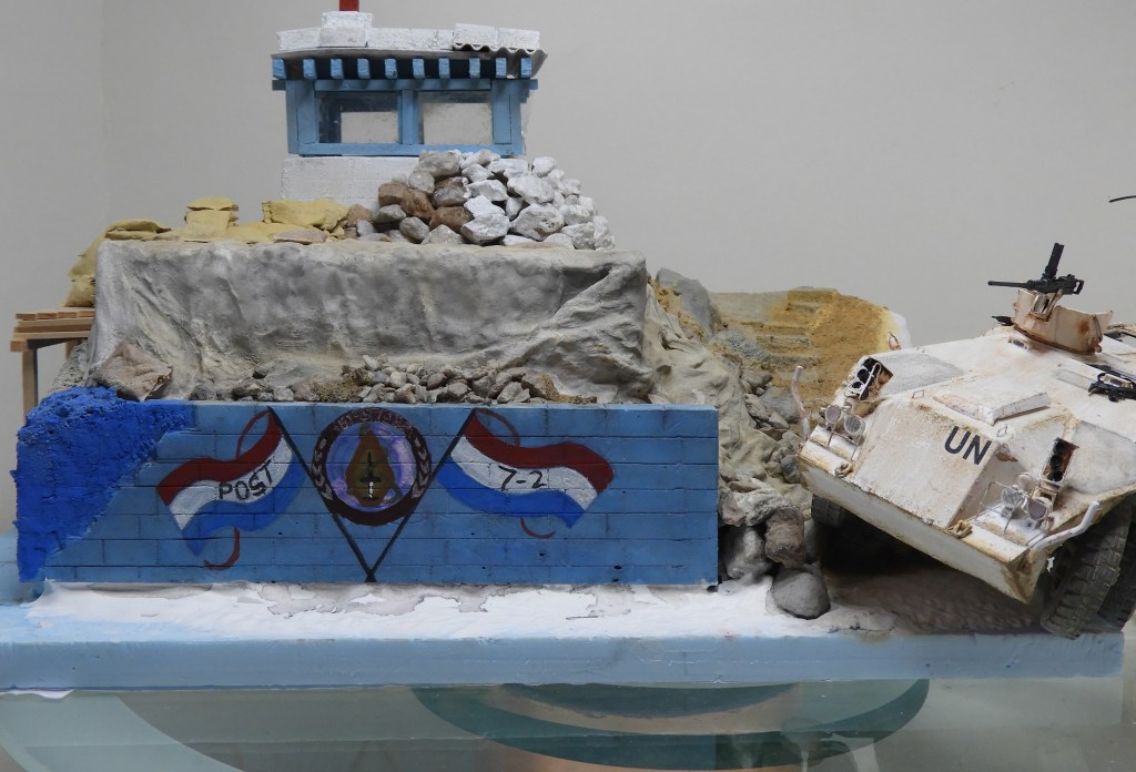 Het meest opvallende deel van post 7-2 was wel de muur die voor de bunker stond. Deze had een prachtig en opvallende beschildering en gaf mij wat hoofdbrekers. Aan de hand van een duidelijke foto werd eerst de muur gemaakt, waarna er met een penseel een muurschildering op werd gekopieerd. De vlaggen en vaandels bleken niet zo’n probleem, maar het embleem in het middels was toch wel andere koek. Na meerdere pogingen, waarvan een hele stomme, want hij was eigenlijk heel mooi en toch was ik niet tevreden. Door eenmaal een poging te ondernemen het gehele embleem overnieuw te doen, beschadigde het teveel. Tenslotte was de ondergrond vrij poreus. Hetgeen mij plamuurwerk opleverde. Geen probleem voor mij op normale grote, alleen even een heel andere verhaal als dit in het klein moet gebeuren, maar het is uiteindelijk gelukt.