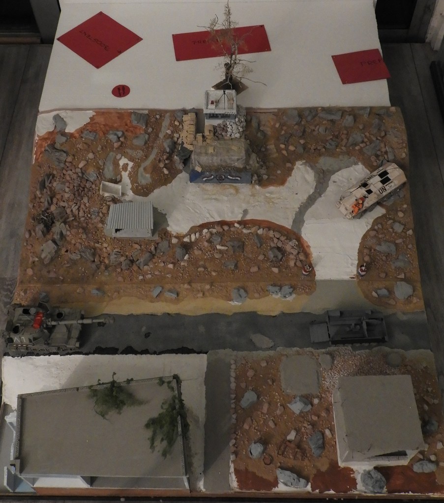 Alles blijkt wel op schaal te koop te zijn, minus natuurlijk dat wat er nodig is voor een Unifil diorama :-). Niet is dit alleen te kostbaar, het is natuurlijk veel leuker om de dingen zelf te maken. Zo kwam een diorama bouwer op Youtube met het idee voor de drums en het hoge gras. Verder heb je daarbij creativiteit en veel geduld nodig. En niet te vergeten, handige handjes. Wat zou er zonder creativiteit zijn gedaan? Op onderstaande foto’s zie je bijvoorbeeld de zelf gemaakte ‘drums’ in de aanhanger staan en daaronder een geplet exemplaar. Waar BBQ schalen al niet handig voor zijn.