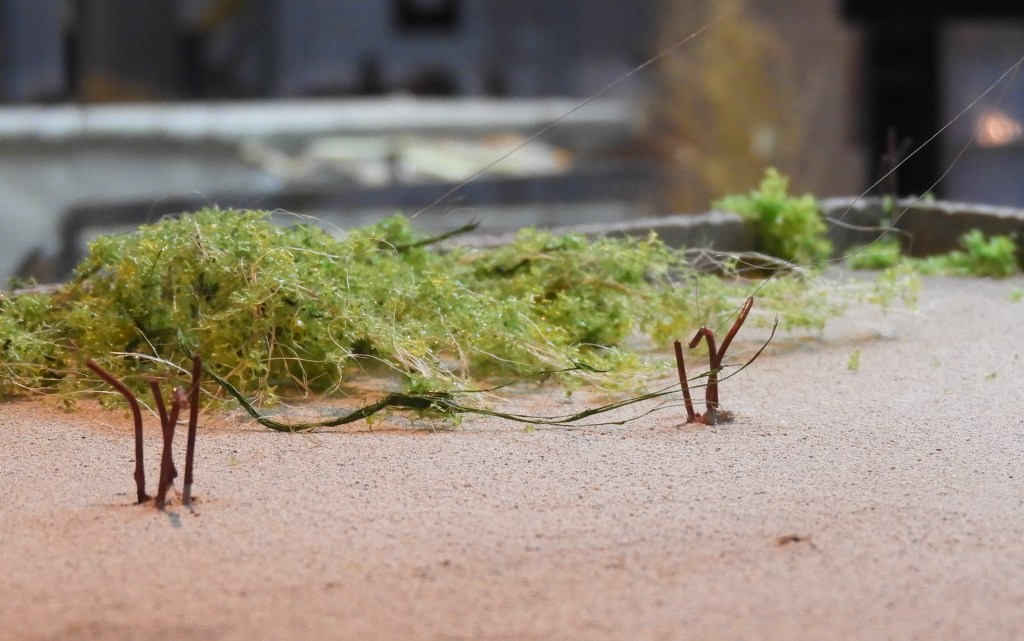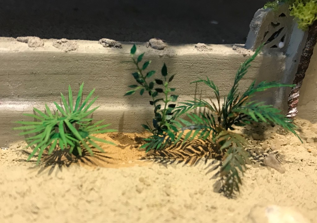 In de loop van de tijd zullen er meerdere plantjes en wat bloeiende groensels worden toegevoegd, dit naar wat er op mijn pad komt. Bovenstaande plantjes komen uit een doosje met ‘jungle’ begroeiing. Eerlijk gezegd ben ik dit soort planten niet in Libanon tegengekomen. (Het is en blijft natuurlijk een ‘aangelegd’ tuintje….. Maar wie weet komt dit nog eens ergens in het echt voorbij, in ieder geval wel in het diorama.