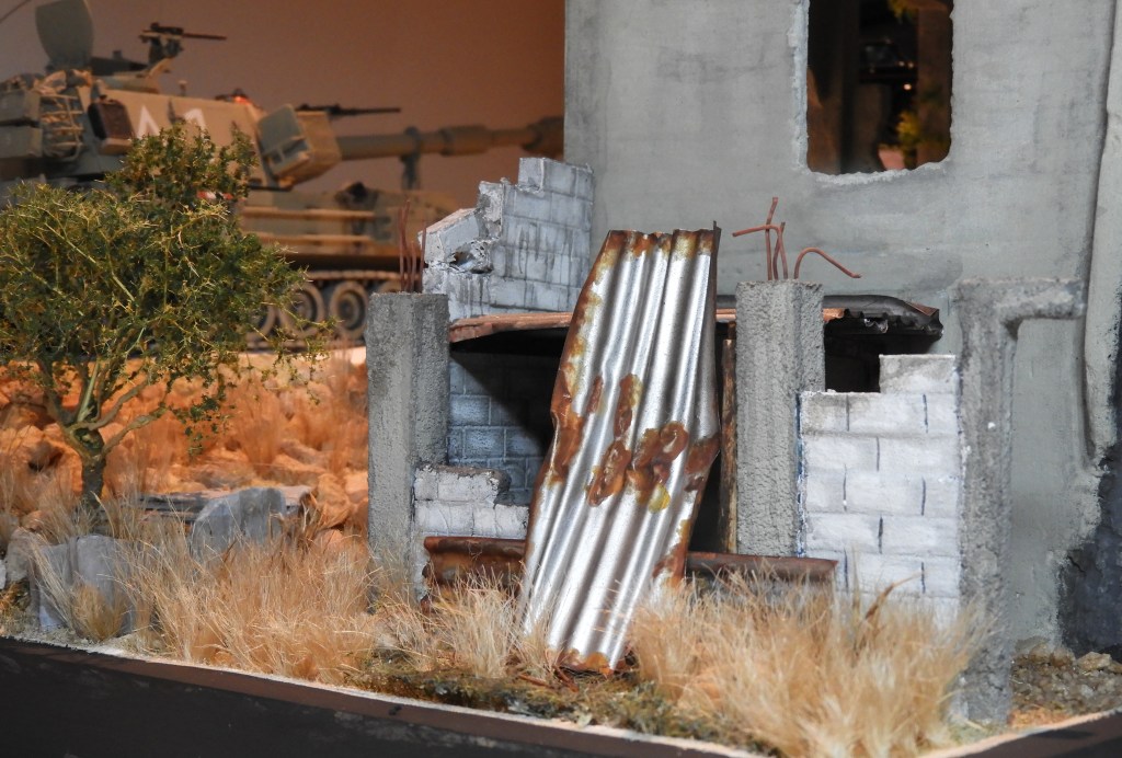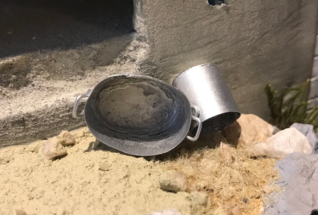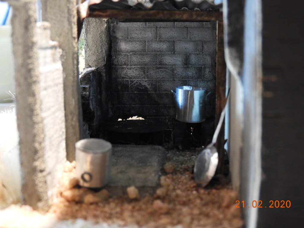 Maar één dingetje was wel een heel groot verschil, het bar weinig respect voor vrouwen. Daar zou één heel hoofdstuk aan gewijd kunnen worden, maar daar gaat het nu even niet over. Neem nou bijvoorbeeld hetgeen zij ter beschikking kregen om een lekkere maaltijd op tafel te zetten. Onbegrijpelijk dat deze vrouw(en) een uitgebreide maaltijd konden maken in een bijna te noemen: “Een door God en iedereen verlaten bouwval“. Het was niet meer dan een met golfplaten bedekt en in deplorabele staat verkerend hok. Het woord ‘keuken’ bestond daar schijnbaar nog niet….. Dit stukje ‘armoede’ MOEST gewoon in het diorama gaan passen. Bij deze!