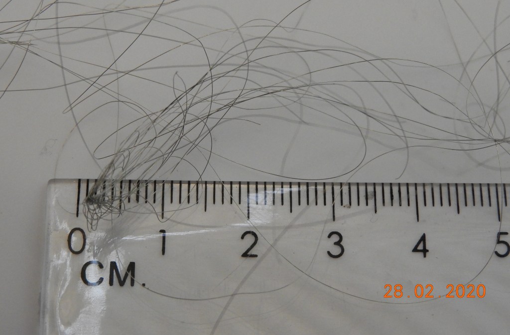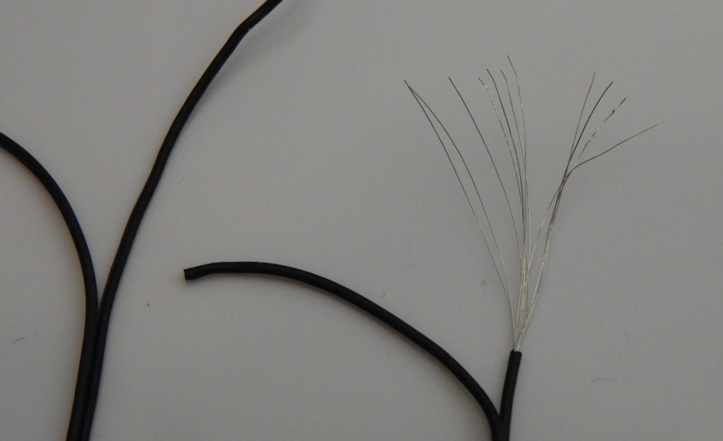 Al zoekende bracht een heel dun elektrodraadje uitkomst. Na het splitten hiervan en daarna te strippen, bleek deze uit uiterst dunnen staaldraadjes te bestaan. Om een werkbare lengte te krijgen werd eerst een lengte van circa 20 centimeter gestript. Althans, dat probeerde ik, maar dit leverde een kluwen van draden op. Daar viel niet mee te werken. Bij de volgende poging werd één uiteinde van de te strippen draad in een klem gezet, om zodoende en klitten te vermijden. Dit leverde een goed resultaat op, al bleken de pieper-de-piep fijne draadjes heel fragiel.