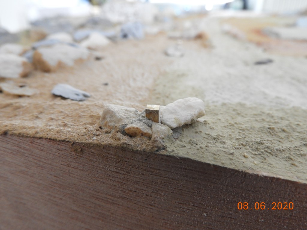 Zodoende zien jullie op de achtergrond de terrassen in aanbouw. Alle steentjes zijn met zorg gelegd. Eerst zodanig dat zij ook echt gestapeld bleven liggen en daarna verlijmd. Om voldoende hechting voor de volgende lagen te creëren en het vlakke op te heffen is een laag gips aangebracht. Zodra deze droog is kan de achterwand verder worden weg-geschuurd en afgewerkt. Waarna de grondlaag en begroeiing zal worden aangebracht.