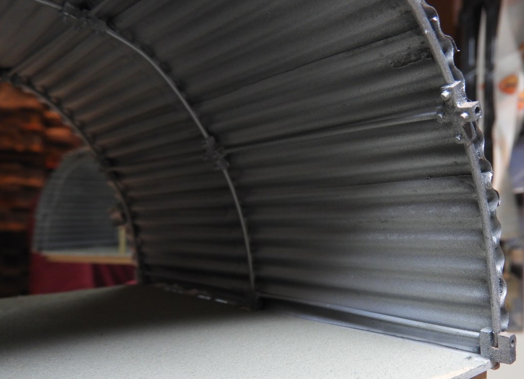 Een markant bouwsel op ons terrein was wel de met golfplaten bedekte boogtent. (Waarvan het zeildoek over de bunker, voor het kotje, was gelegd en door de zon totaal was verkleurd). Het heeft mij heel erg veel puzzelwerk en creativiteit gekost om tot een plan van aanpak te komen. Allereerst is er plattegrond, op exacte schaal, op een A4-tje van het aluminium frame getekend. Hierop werd met Evergreen -polystyreen- het buizenstelsel en de verbindingsstukken gelijmd. De verbindingsstukken zijn net als in het origineel voorzien van insteekpunten om zodoende een stevig geheel te vormen. Die verbindingstukken zijn gemaakt uit een vierkant staafje en net zolang gevijld tot een net resultaat. Over dit, nog steeds vlakke frame, werden de golfplaten gelijmd en drie maal gespoten. (Zwarte primer, aluminium, matte vernis).
