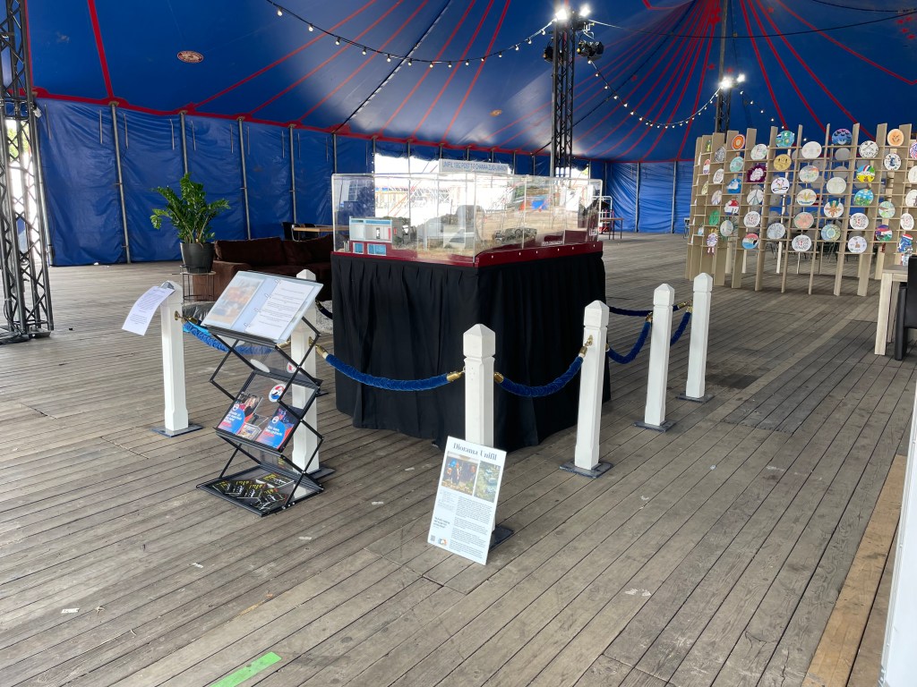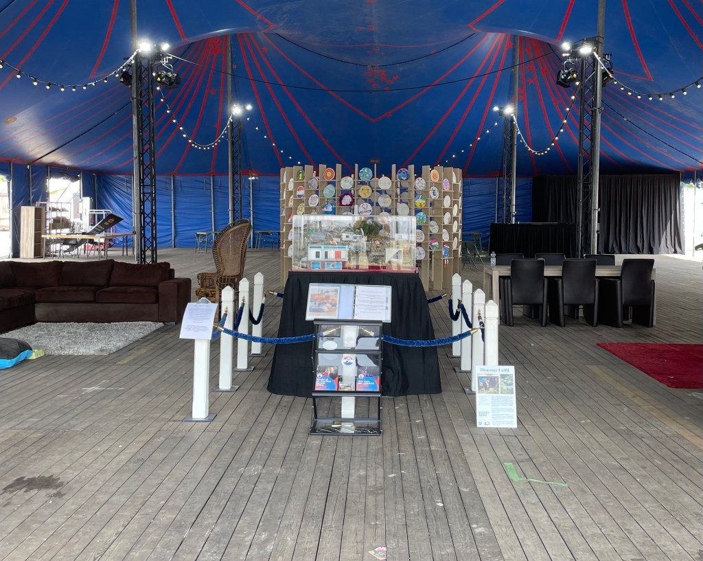 Na alles met Saskia in het autootje te hebben geladen reden Sophie en ikke even later naar het Haagsche. Onderweg trotseerden wij menig scheldende automobilisten want ieder hobbeltje of verkeersdrempel moest in versnellingsstandje ‘schildpad’ worden genomen. Aangekomen in Den Haag was het even zoeken naar de juiste ingang en dat kostte ons een extra toeristisch rondje om het Malieveld. Maar goed, even later reden wij door de poort en parkeerden wij naast de juiste tent. (Gaat dit wel goed komen? Het waaide en het stof vloog ons rond de oren, dat vindt het diorama echt niet fijn!).
