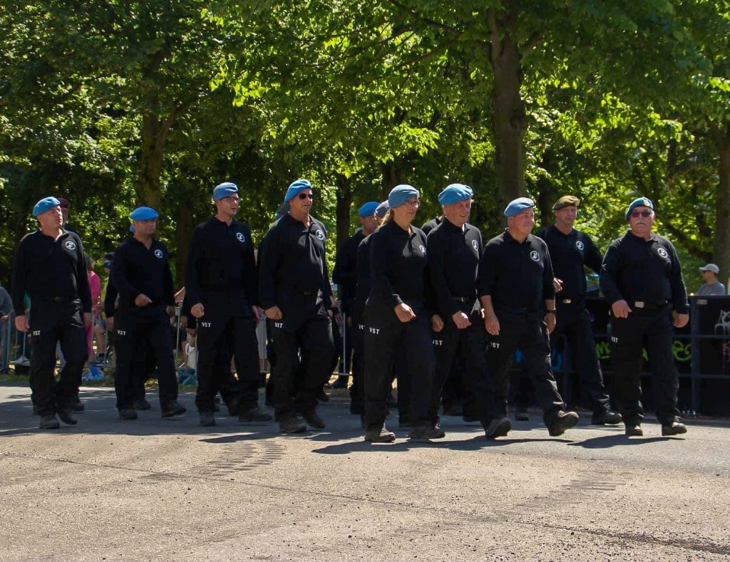 Na deze podcast was het de hoogste tijd om het ‘oud-groen’ om te wisselen voor ‘VST-zwart’. (‘Oud-groen’ is het uniform wat ik in Libanon droeg en ‘VST-zwart’ is de hedendaagse outfit waar ik mij 24/7 voor inzet). Ik liep dus mee in het defilé bij het VST. Ze zeiden toch echt 13:00 uur verzamelen dus stonden wij daar gezagsgetrouw dan ook. Het duurde echter ruim een uur voordat wij de eerste pas zette en dat terwijl de eerste groepen die deelnamen reeds waren teruggekeerd op het Malieveld! *(Die 0,0036 graden RJ-verkoeling waren nu meer dan welkom geweest). Maar goed, zo’n rondje defilé door het Haagsche maakte alles weer goed. Heb ik de Koning gezien? Nee, want als frontvrouw blijf je recht vooruit kijken, ook al passeer je hem op 2 meter afstand. (Net als ik hem ook niet zag toen hij zowat op mijn tenen stond met dodenherdenking op de Dam). Het gaat er op die manier dus nooit van komen dat ik deze beste man de hand kan schudden….